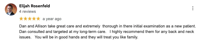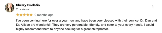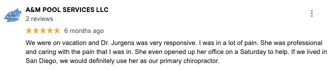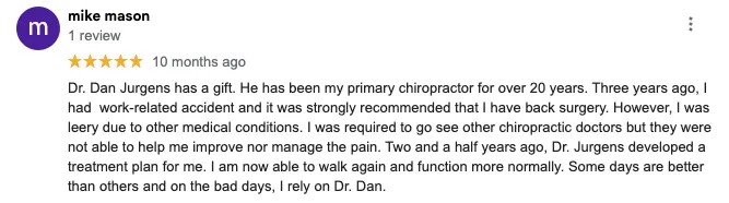 Disclaimer: Procedures and treatments performed by Jurgens Chiropractic have an inherent success (and failure) rate. Reviews, testimonials and content on this site should not be interpreted as a statement of efficacy of procedures and treatments performed by Jurgens Chiropractic for anyone else.